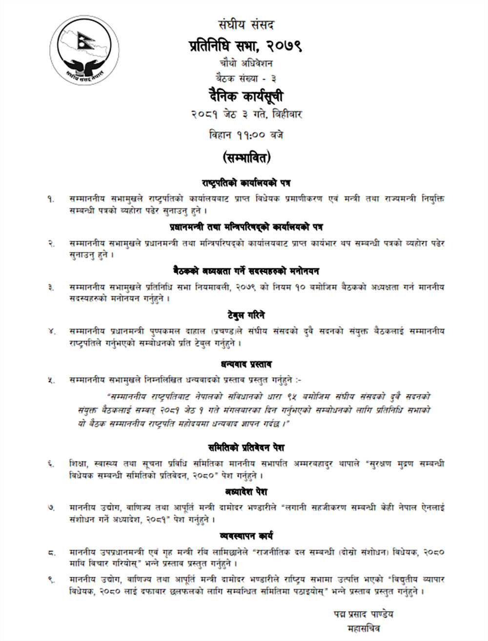 बिहीबार बस्ने प्रतिनिधिसभाको बैठकको सम्भावित कार्यसूची सार्बजनिक