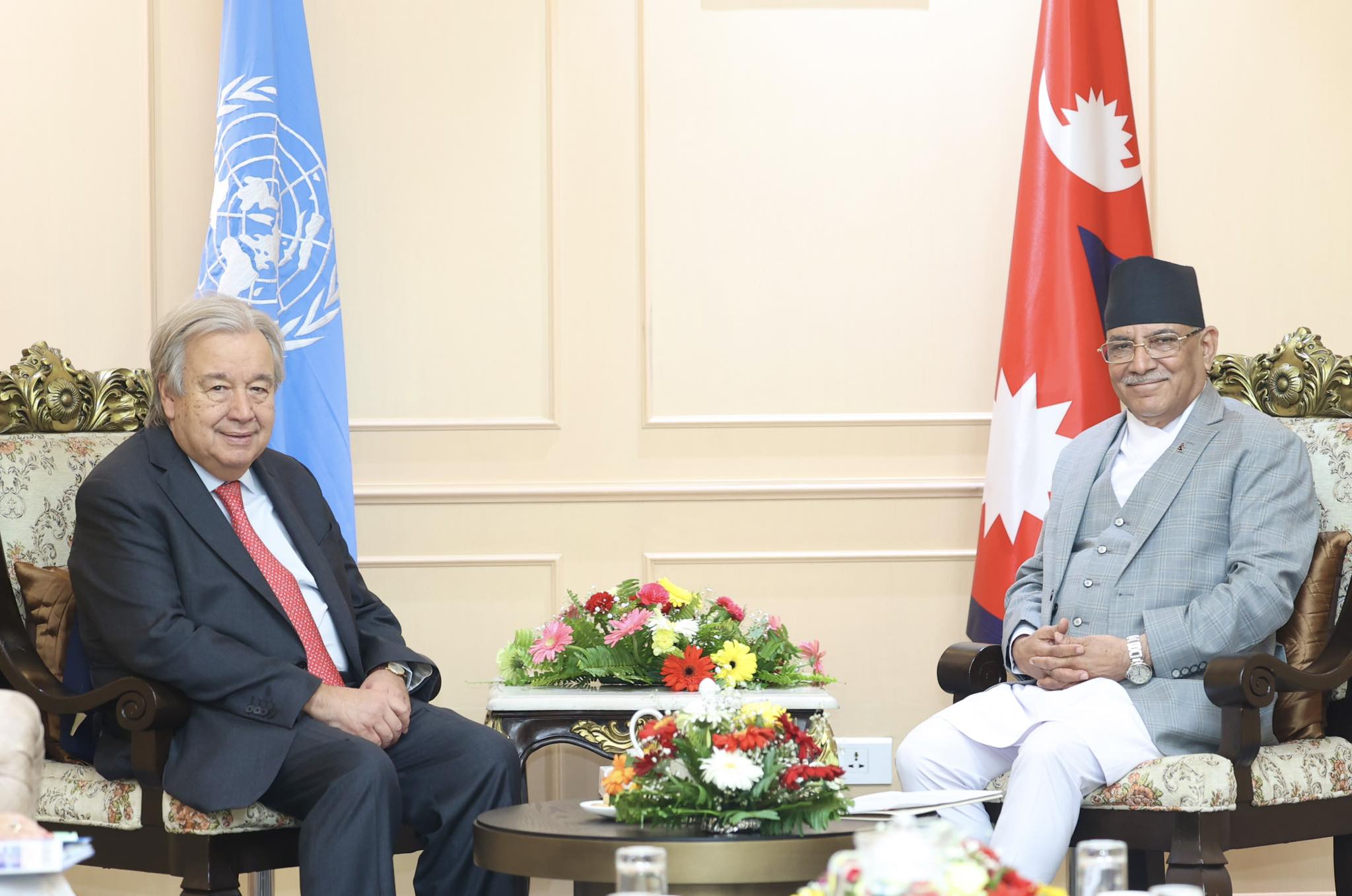 प्रधानमन्त्री प्रचण्ड र महासचिव गुटेरेसबीच सिंहदरबारमा भेटवार्ता
