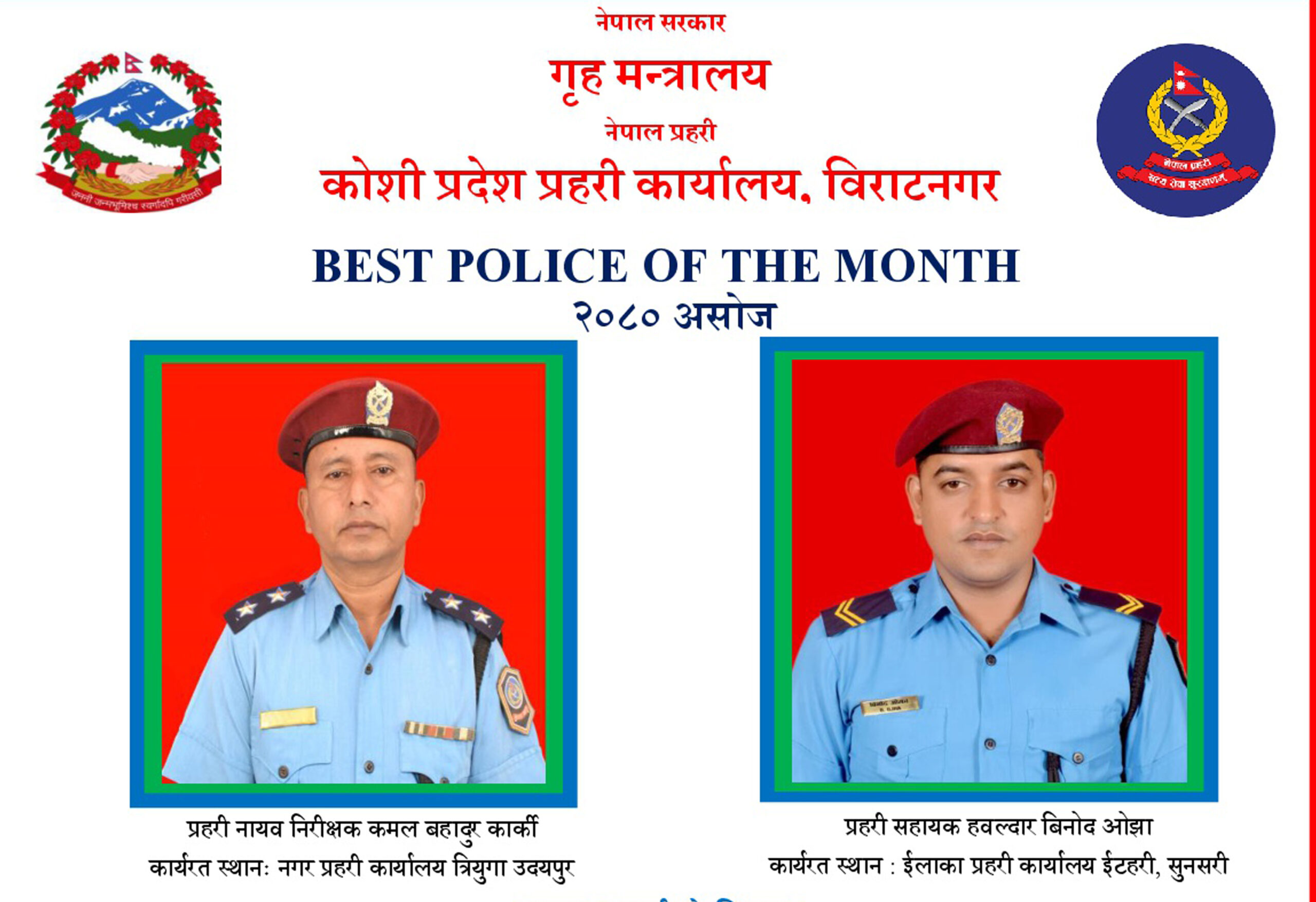 असोज महिनाको सर्वोत्कृष्ट प्रहरी उदयपुरमा कार्यरत प्रहरी नायव निरीक्षक कार्की र सुनसरीमा कार्यरत प्रहरी सहायक हवल्दार ओझा घोषित