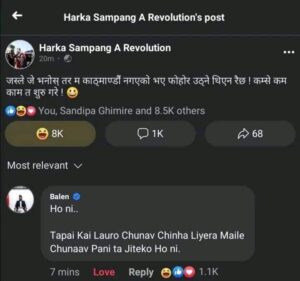 उहाँले आज सामाजिक सञ्जालमा ‘जसले जे भनोस् तर म काठमाडौँ नगएको भए फोहोर उठ्ने थिएन रैछ, कमसेकम काम त सुरु गरे’ भनेर हाँसेको इमोसहित पोष्ट गर्नुभयो । सोही पोष्टमा काठमाडौं महानगरपालिकाका मेयर बालेन्द्र साह बालेनले व्यग्य गर्दै कमेन्ट गर्न भ्याउनुभयो । बालेनले कमेन्टमा ‘हो नि.. तपाईकै लौरो चुनाब चिन्ह लिएर मैले चुनाब पनि त जितेको हो नि’ भन्दै ब्यग्य गर्नुभएको छ । मेयर साम्पाङले गरेको पोष्टमा हजारौं कमेन्ट छ । सकारात्मक र नकारात्मक दुबै खालका कमेन्टले सामाजिक सञ्जाल रंगिएको छ ।