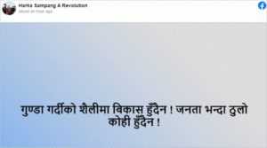 काठमाडौं । धरान उपमहानगरका मेयर हर्क साम्पाङले ”गुण्डा गर्दीको शैलीमा’ विकास नहुने बताएका छन्। काठमाडौं महानगरपालिकाका मेयर बालेन साहले अवैध संरचना हटाउन अभियान चलाइरहेका बेला सोही तर्फ संकेत गर्दै हर्कले यस्तो लेखेका हुन। हर्कले आफ्नो फेशबुकमा गुण्डा गर्दीको शैलीमा बिकास हुँदैन ! जनता भन्दा ठुलो कोही हुँदैन ! पोष्ट गरेका छन् ।
