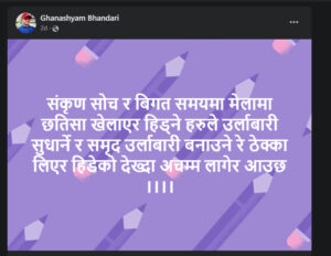 त्यस्तै, वाइसिएल नेपाल मोरङका संयोजक राजिब लिम्बूले पनि भागबन्डा नपाएको बहानामा महोत्सव असफल बनाउन केही लागि परेको दाबी गर्नुभएको छ । उहाँले पनि सामाजिक सञ्जालमा नगरप्रमुख खरेललाई नै इकित गर्दै लेख्नुभएको छ –‘चुनाव जितेर आफ्नु कार्यकर्ताहरुलाई पालन पोषण गर्नु खोज्ने जनप्रतिनिधिलाई खबरदार । राजा बन्ने प्रयास नगर्नु होला ।’