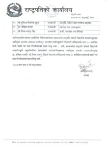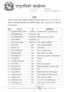 राष्ट्रपति विद्यादेवी भण्डारीले नवनियुक्त मन्त्रीहरूलाई नेपालको संविधानको धारा ७६ को उपधारा (९) बमोजिम प्रधानमन्त्रीको सिफारिसमा नियुक्ति, हेरफेर र कार्य विभाजन गरकी हुन् ।